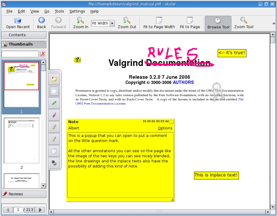 Okular is a universal book viewer based on KPDF for KDE 4. This means Okular works on multiple platforms, including but not limited to Linux, Windows, Mac OS X, *BSD, etc. Okular combines the excellent functionalities of KPDF with the versatility of supporting different kind of documents, like PDF, Postscript, DjVu, CHM, XPS, ePub and others.