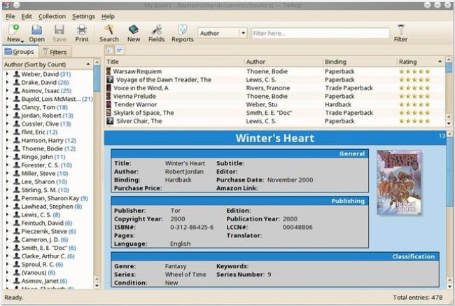 Tellico is a software application for organizing your book collection. Tellico allows you to enter your collection in a catalogue database, saving many different properties like title, author, etc. Different views of your collection can be shown. The data is saved in XML, a text format which makes for easy parsing, portability, and styling. It will run on any platform which KDE supports, most commonly Linux. Tellico is licensed under the GNU General Public License, giving you the freedom to modify and distribute the source code.